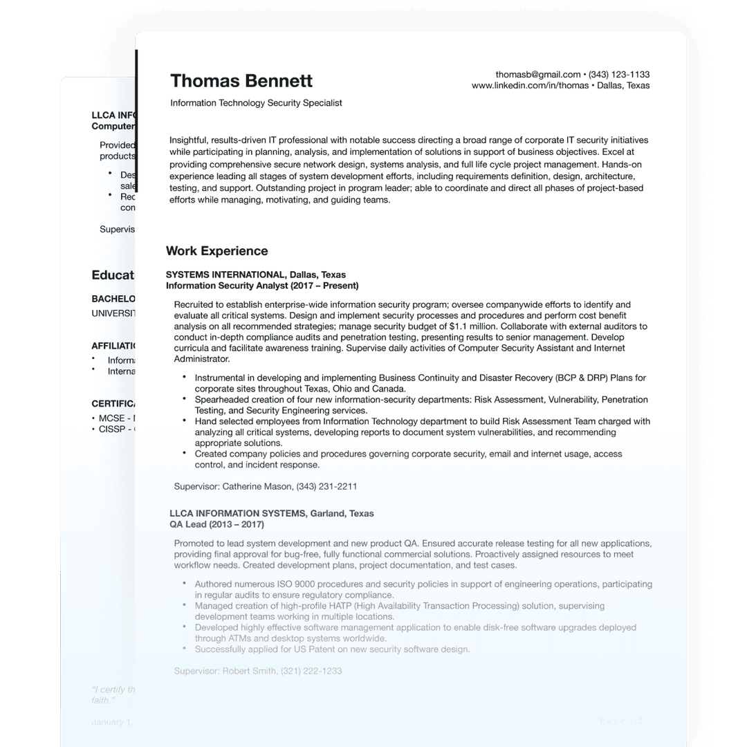 Federal job applications demand precision and adherence to strict templates—deviating from these can disqualify your application. With TopResume, you’ll get a professionally crafted federal resume that aligns with government standards, tailored to your target role. Our expert writers simplify the process, ensuring every application you submit is optimized for success.
